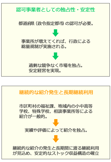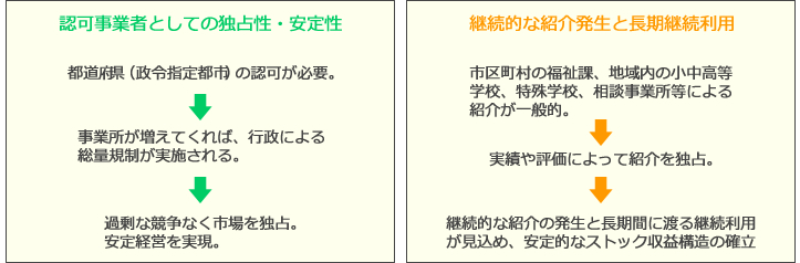 都道府県(政令指定都市)通所施設事業者としての認可(指定)が必要です。新規の指定は地域内の児童の利用状況等に応じて認可されるため、総量規制前にいち早く参入することがポイントになります。過剰な競争なくマーケットを独占し安定経営が見込めます。