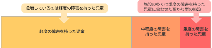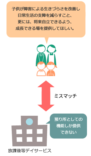 平等な受け入れが故の施設の『預かり所』化は、急増している中軽度障害児童の成長機会の損失を生み、また、放課後等デイサービスは保護者負担軽減の一時的対処しか提供できず、根本解決にはならないとの問題指摘がされはじめています。