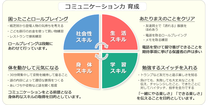 ATカンパニーでは、コミュニケーション力を身につけることを目的とした『療育型』放課後等デイサービス事業をご提案します。社会性スキル、生活スキル、学習スキル、身体スキルの4つのテーマ別にトレーニングカリキュラムを提供。カリキュラムは児童ごとにテーマに合わせて選定し、グループワークで楽しい時間を過ごす中でそれぞれのスキルを習得しながら、コミュニケーション力を高めることが可能です。業界の課題を解決する事業としての期待が高く、全国最大級118の事業所を展開しております。(※平成30年月6時点、118事業所うち95事業所が放課後等デイサービス)